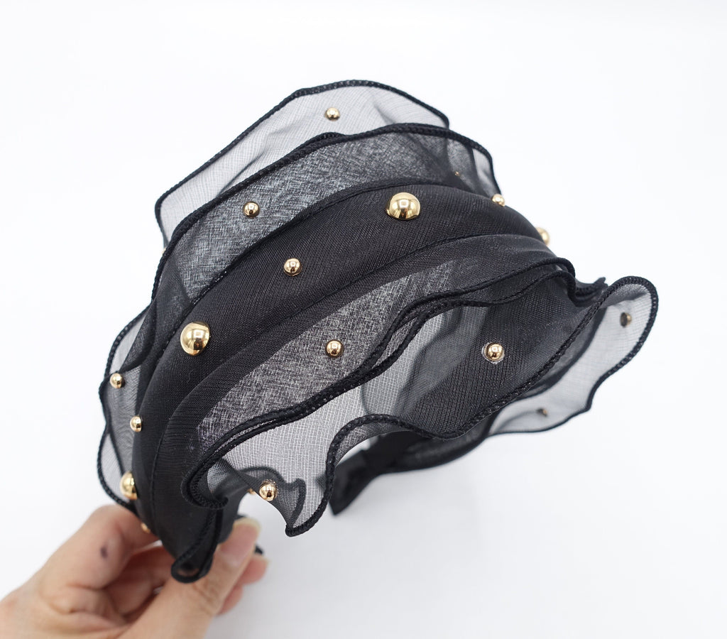 golden ball embellished triple lettuce hem headband organdy hairband mesh hair accessory for women
