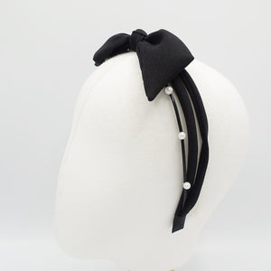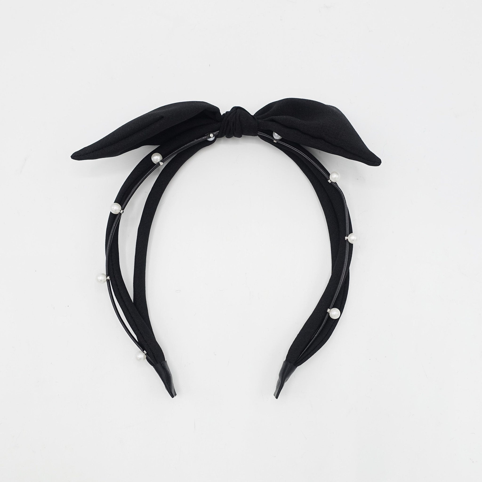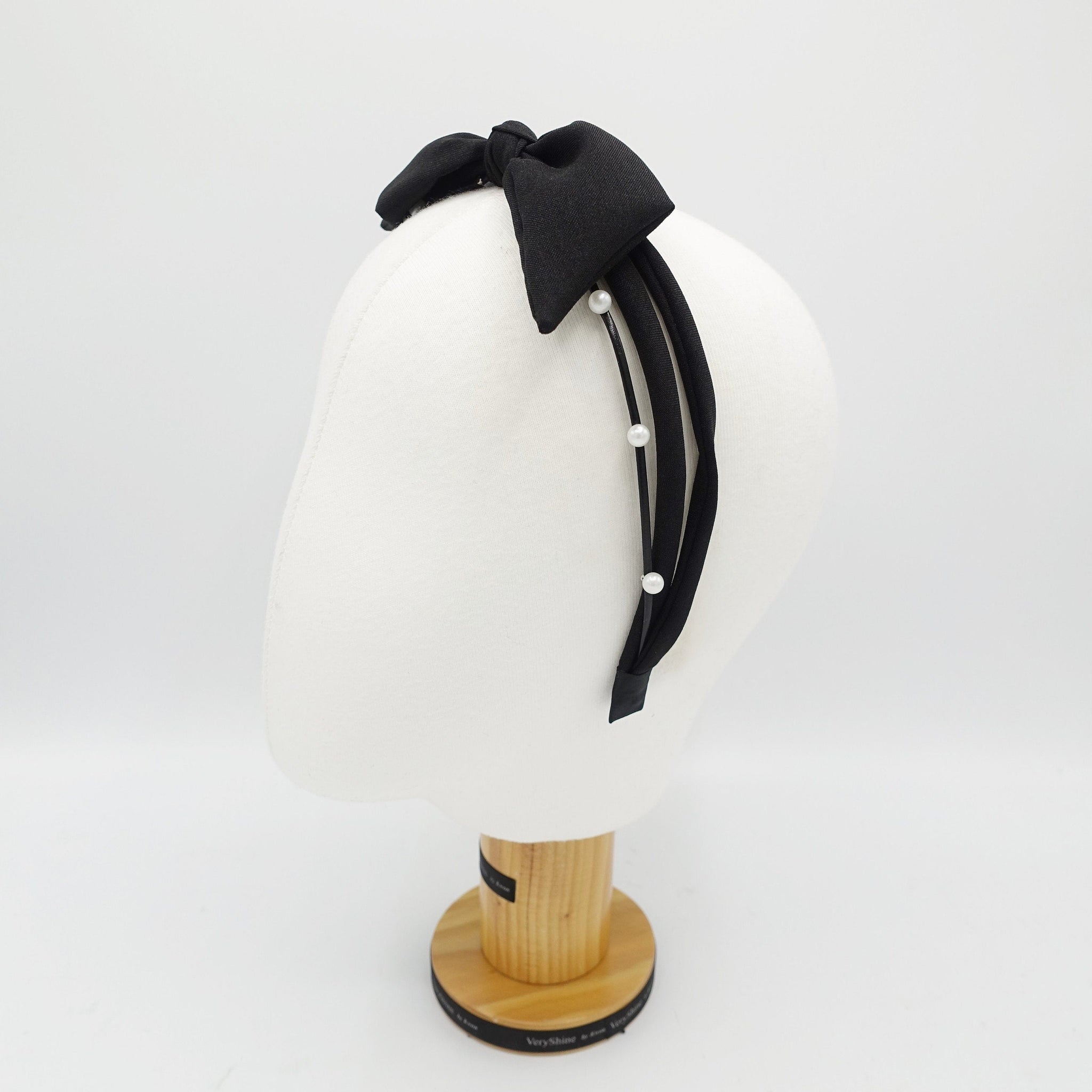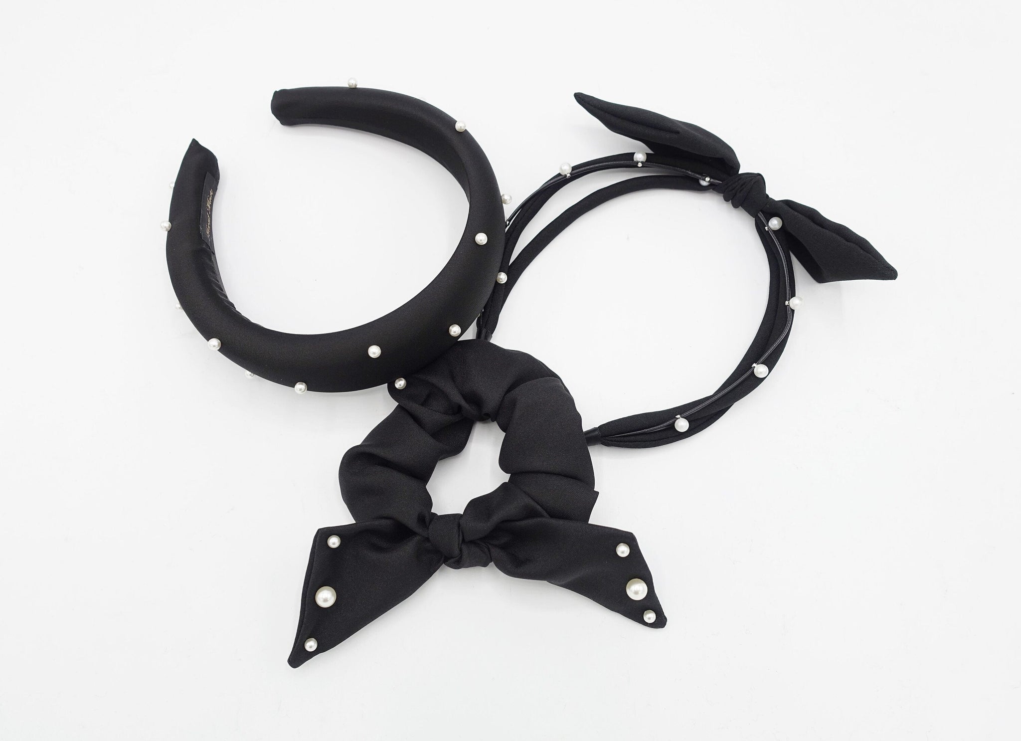 black color with a white pearl on headbands and bow scrunchies are simple and create classy mood