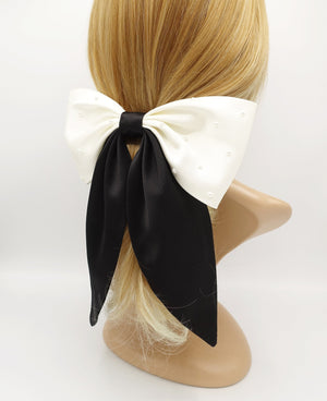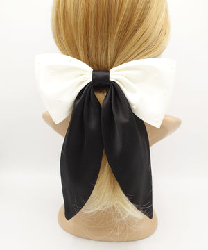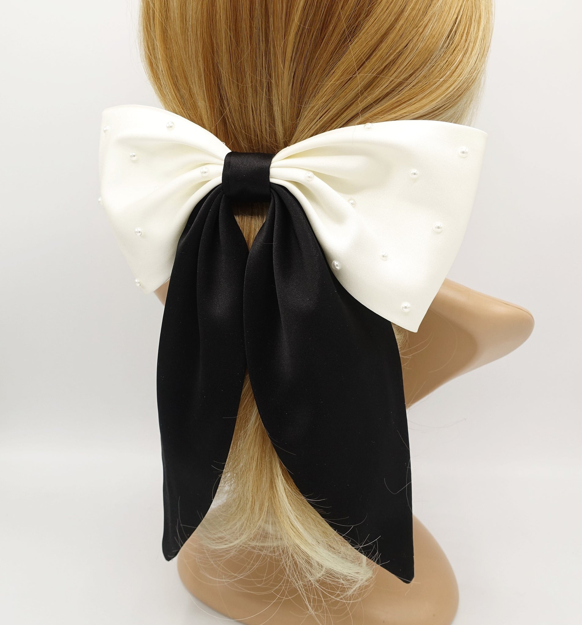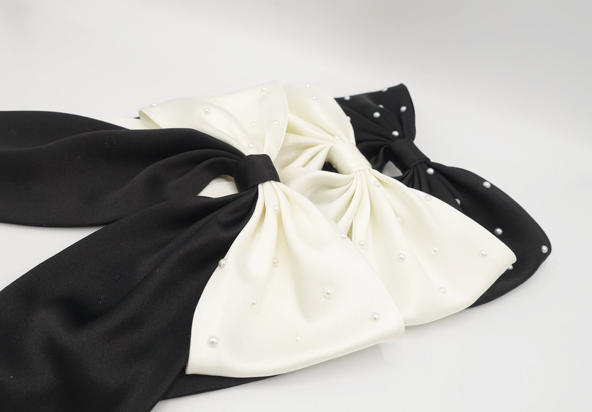 veryshine3 claw/banana/barrette Black &  Cream white pearl embellished satin hair bow big size large hair bow for women