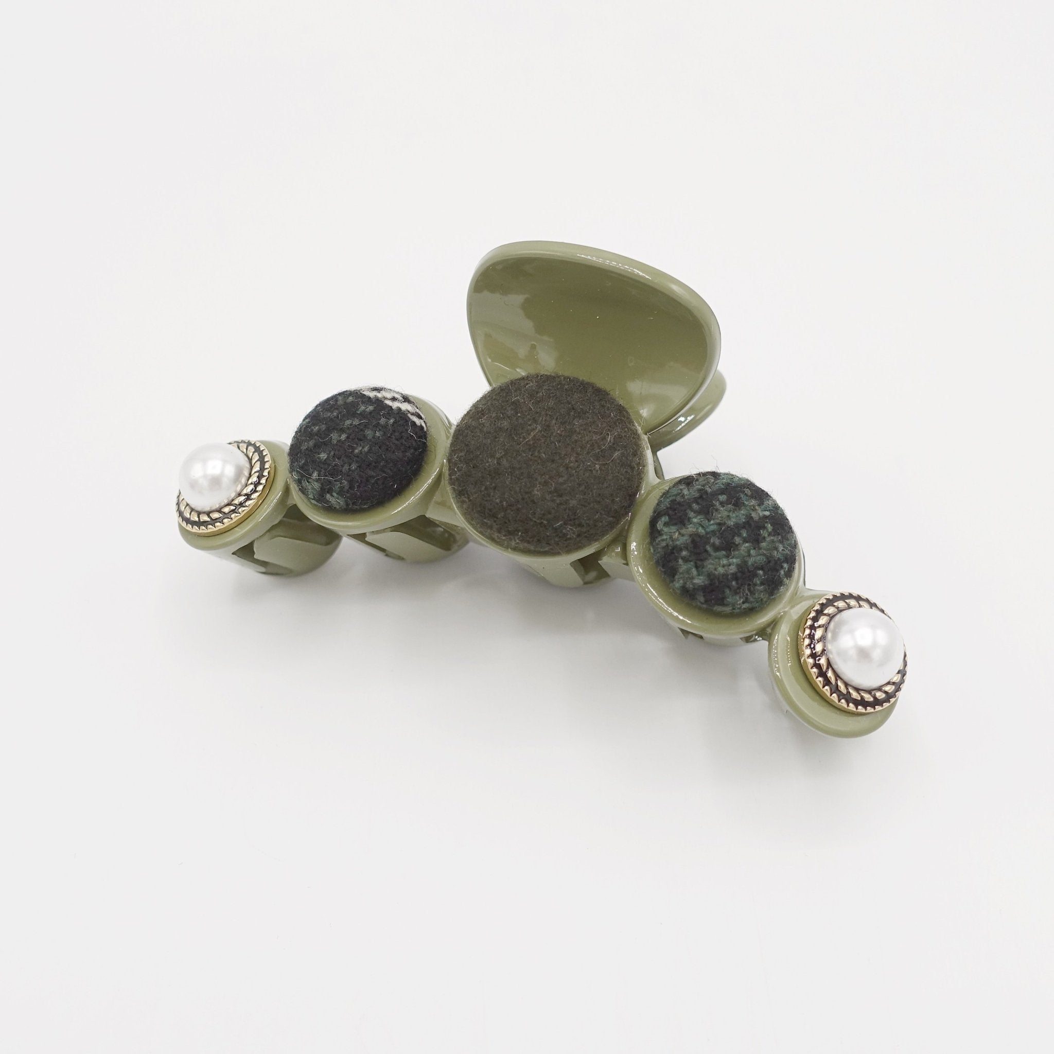 VeryShine claw/banana/barrette Khaki green button hair claw woolen fabric pearl button embellished hair clamp updo hair accessory for women