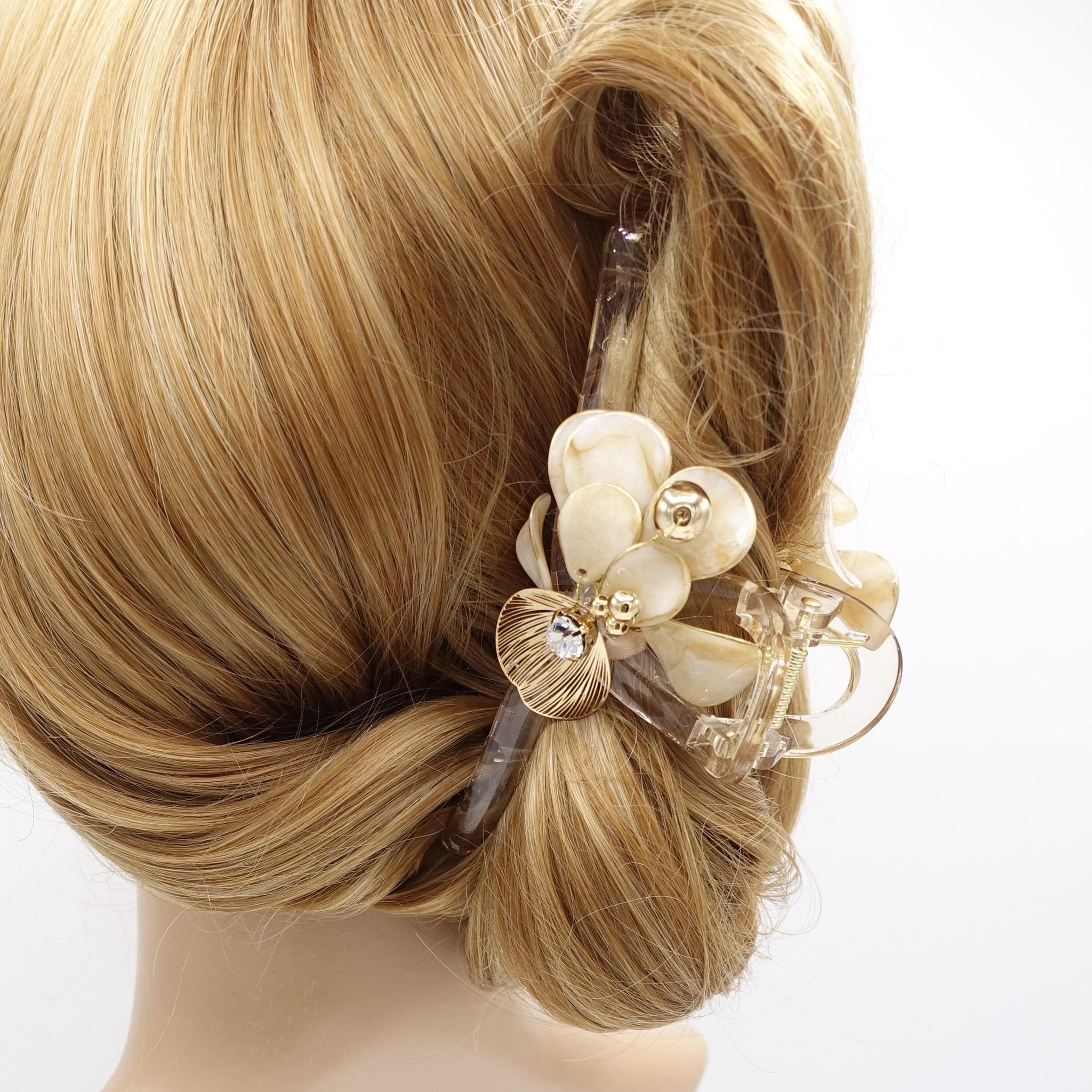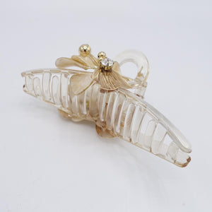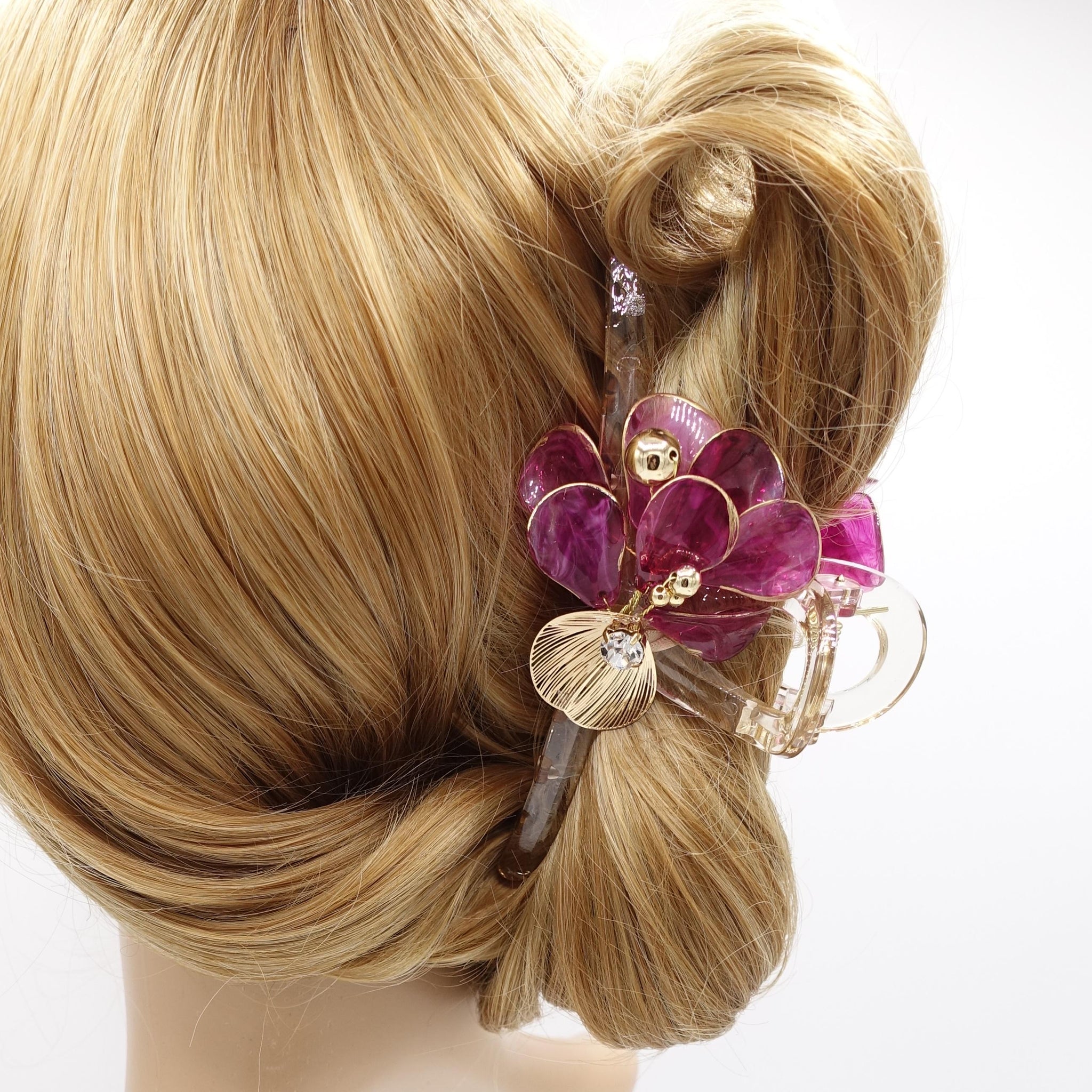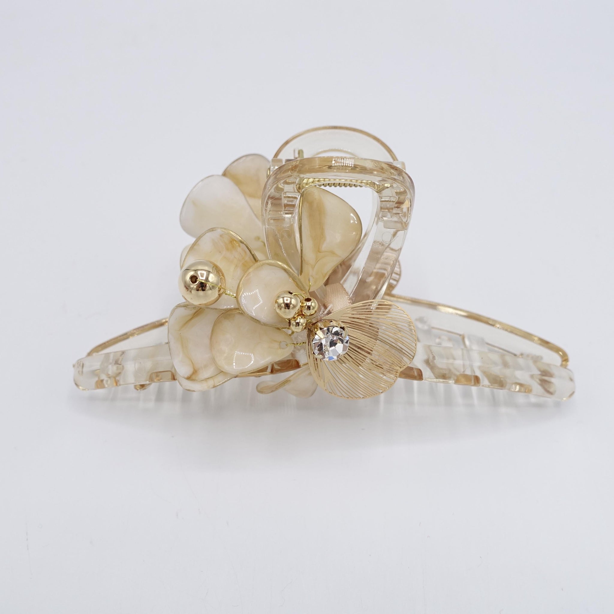An exquisite handmade hair claw embellished with a handcrafted flower composed of acrylic, metal, rhinestones, and gold beads