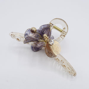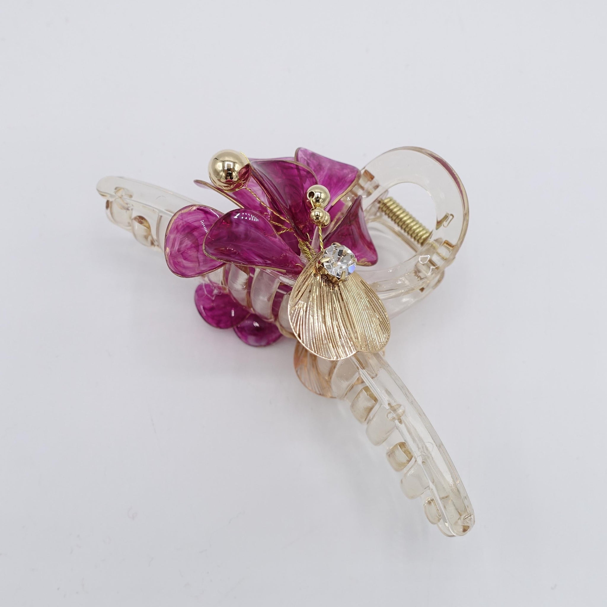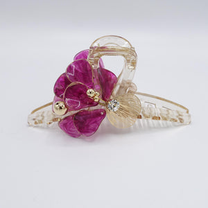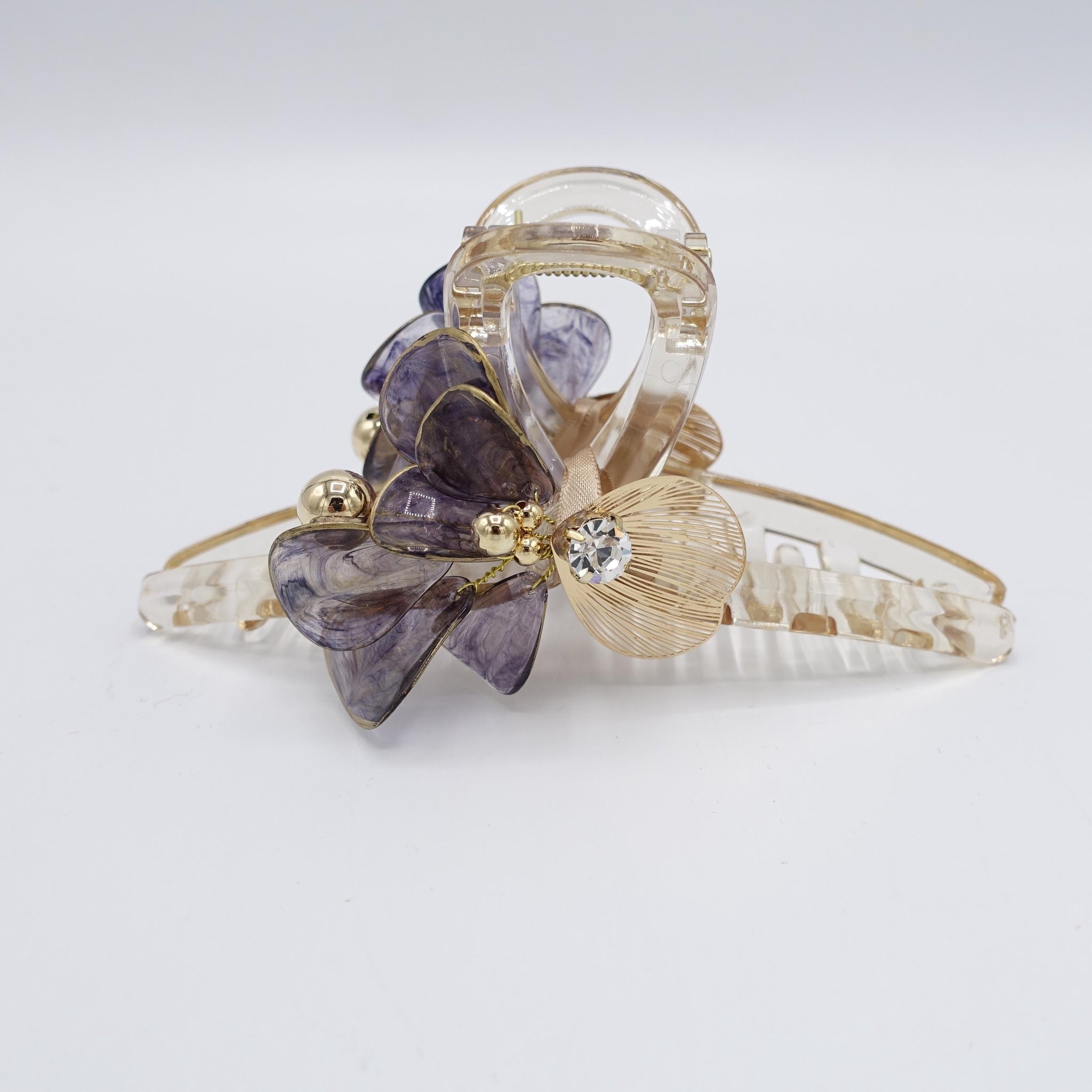 An exquisite handmade hair claw embellished with a handcrafted flower composed of acrylic, metal, rhinestones, and gold beads