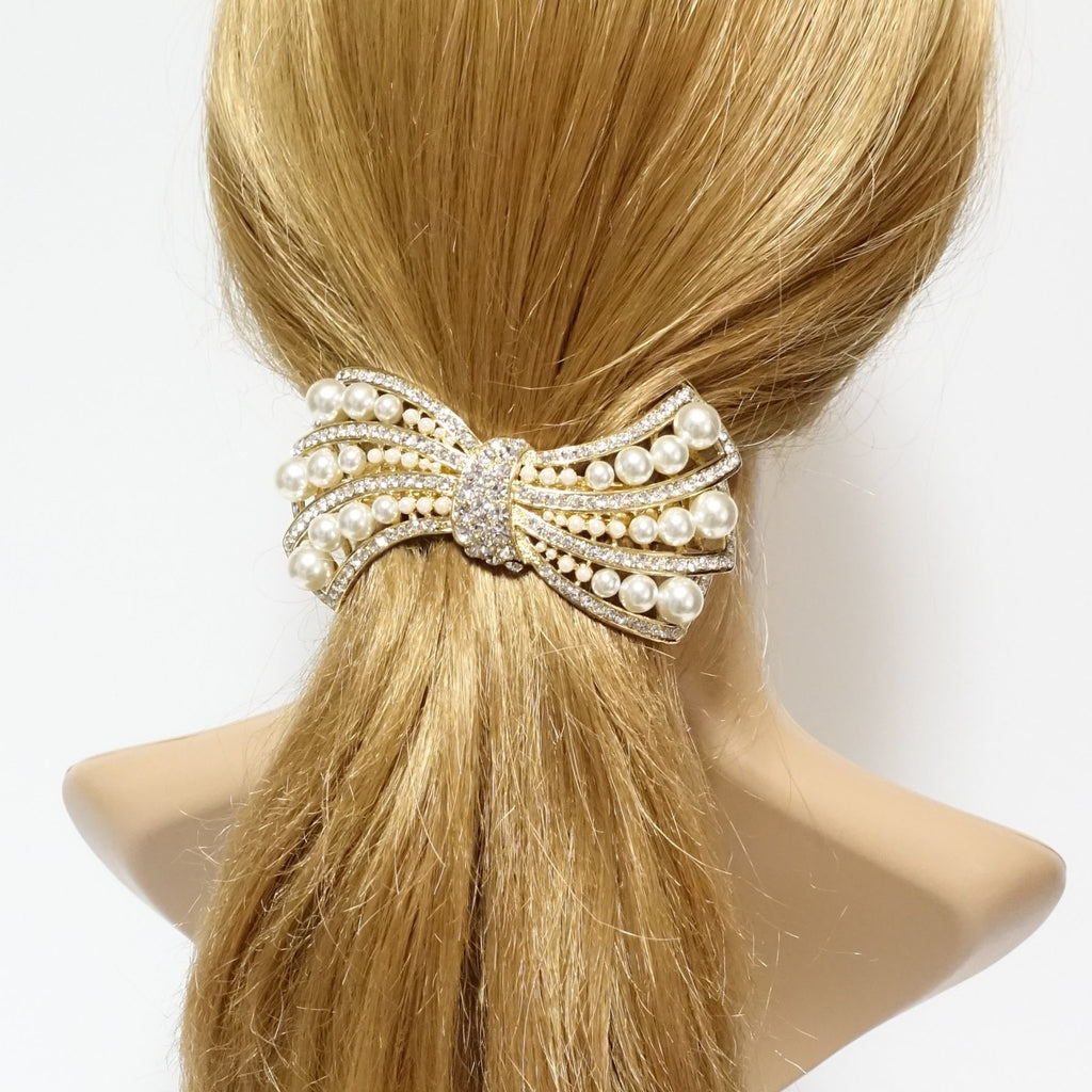 pearl rhinestone decorated leaf wave bow french barrette elegant dazzling women hair barrette